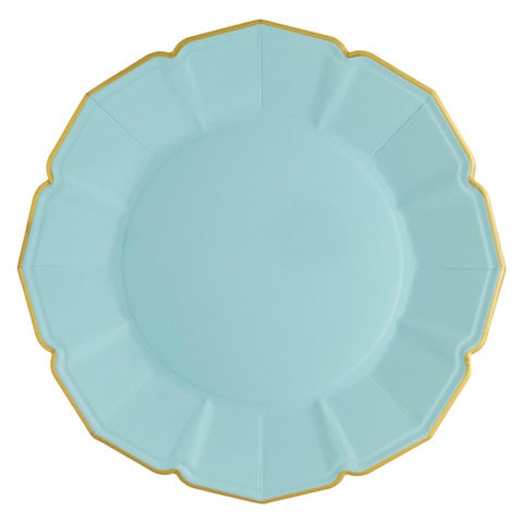 These beautiful, stylish sky blue dinner plates will elevate your party, baby shower or gender reveal party. With the look of fine porcelain, the elegant design and gold foil scalloped edge will leave your guests surprised that these are paper plates.