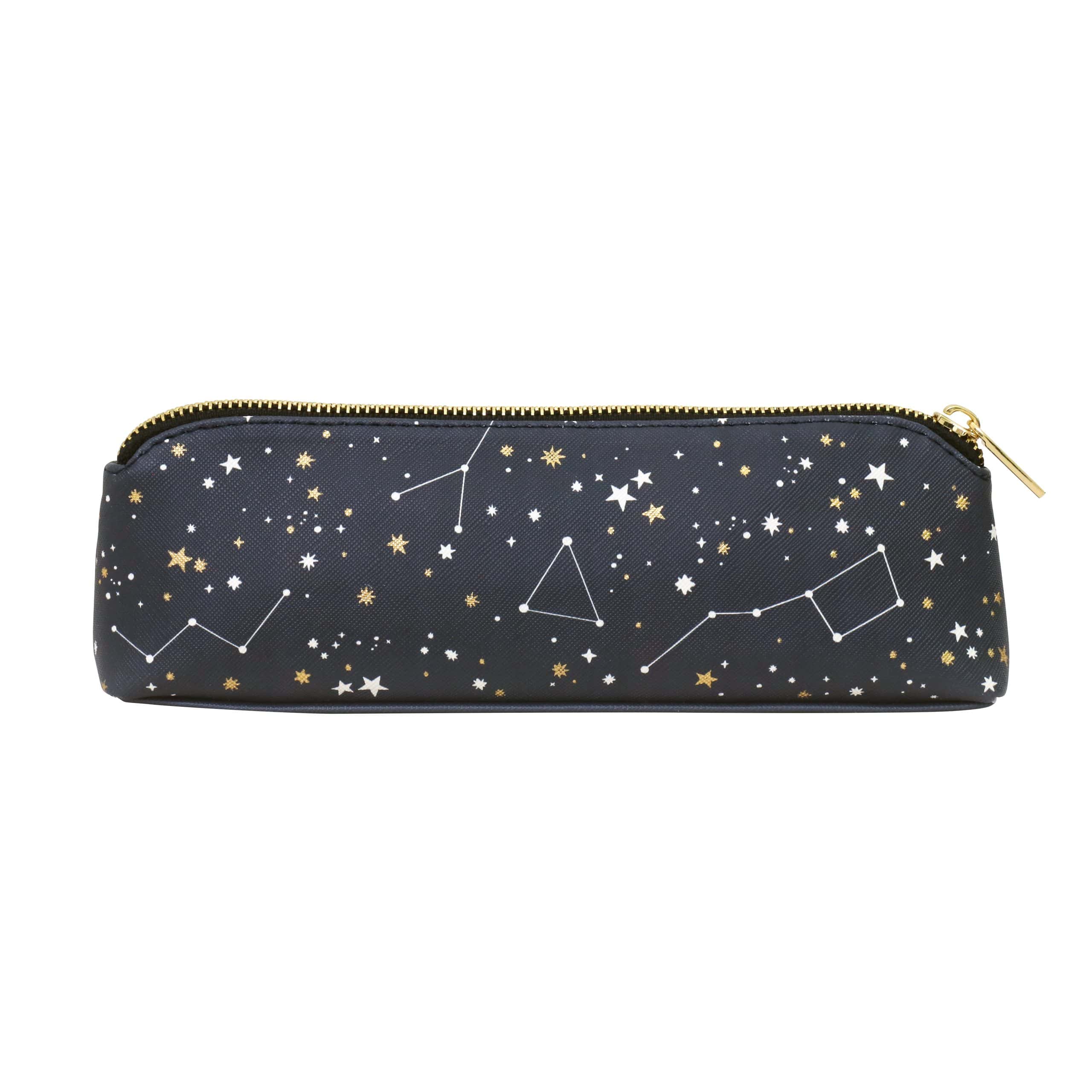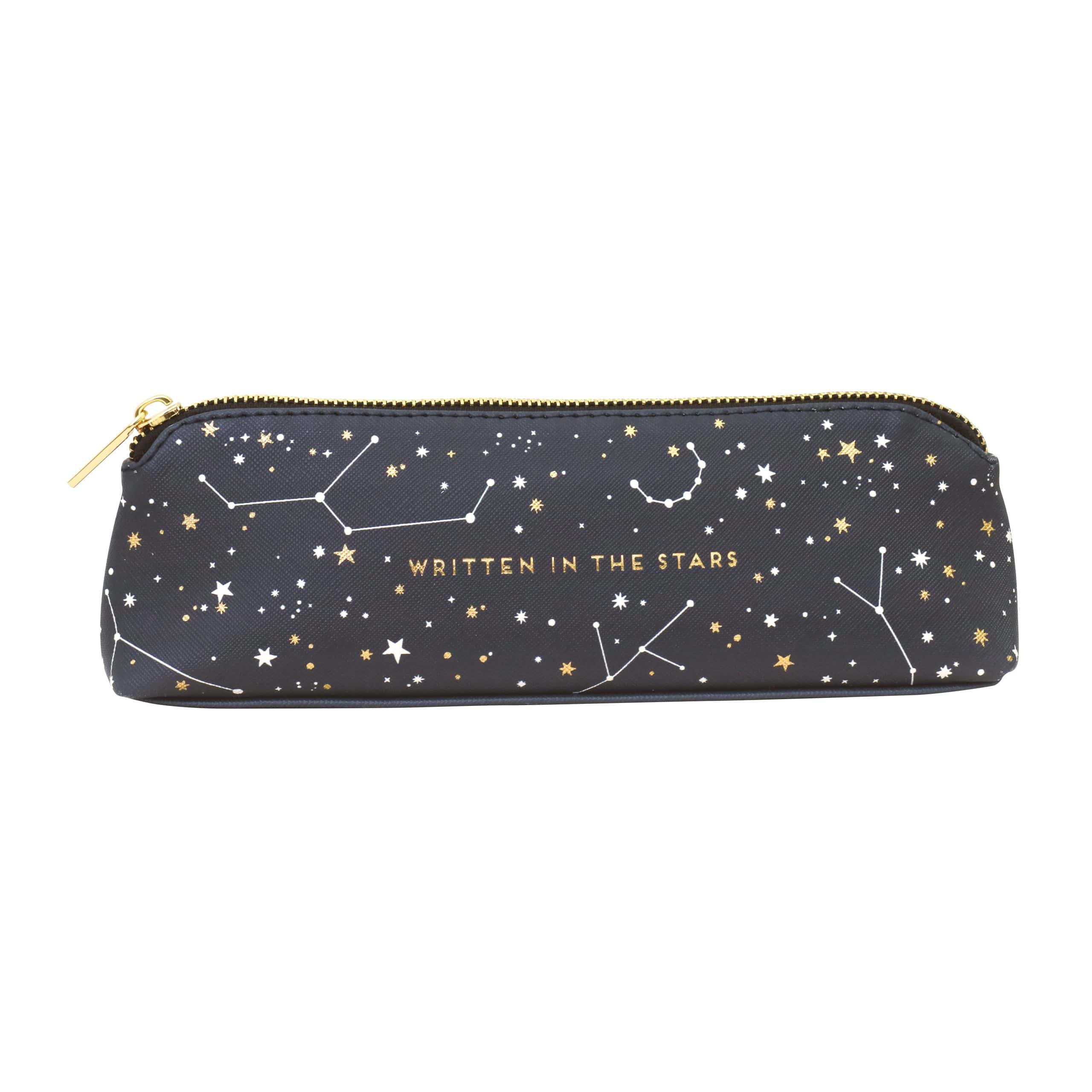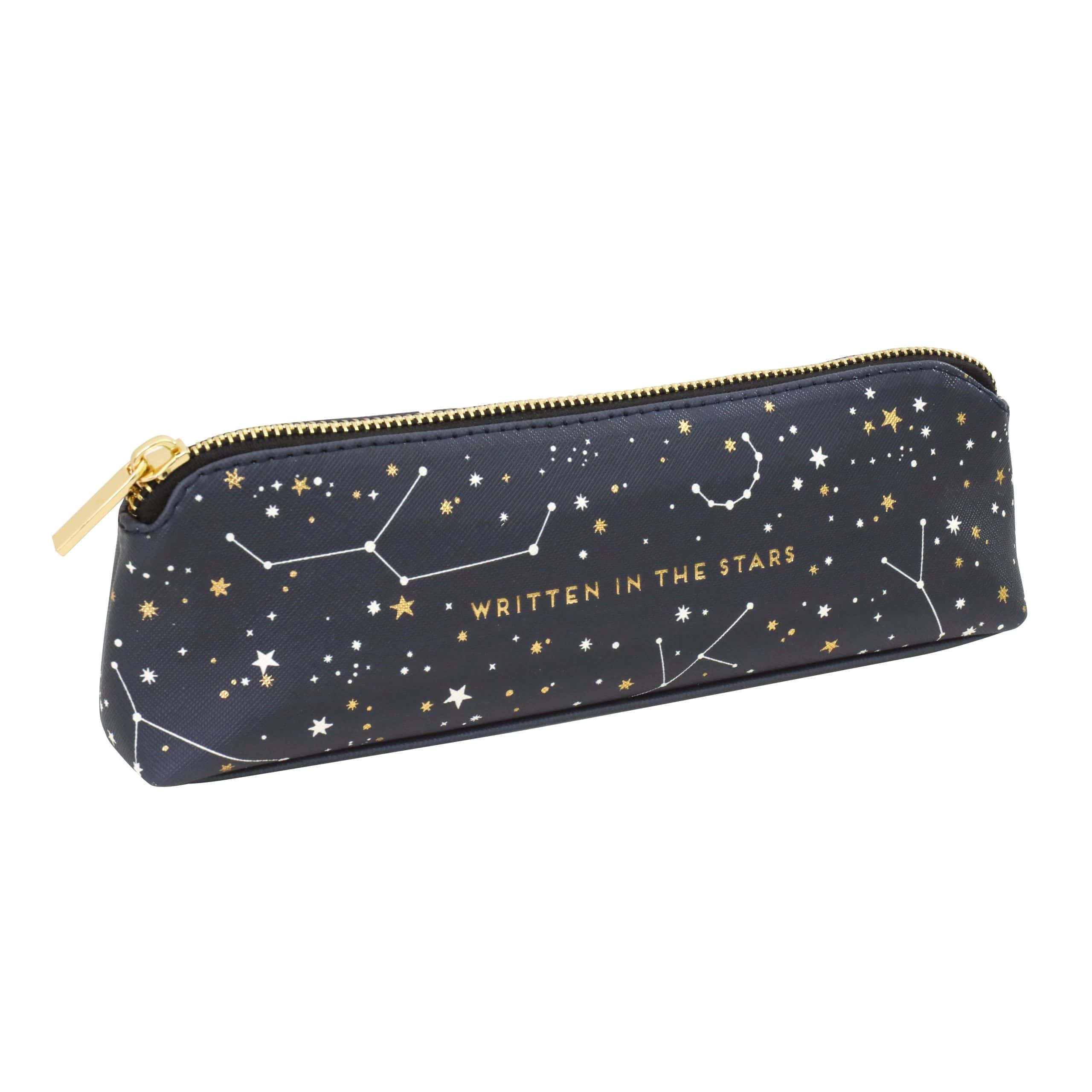 Always be prepared with this gorgeous Pencil case from British designer and illustrator Alice Scott, a stylish faux leather pouch in striking gold & white constellations pattern, gold metal zip and gold foil detailing, perfect for holding all your essential stationery tools will fit neatly into your handbag and brighten up your working day.