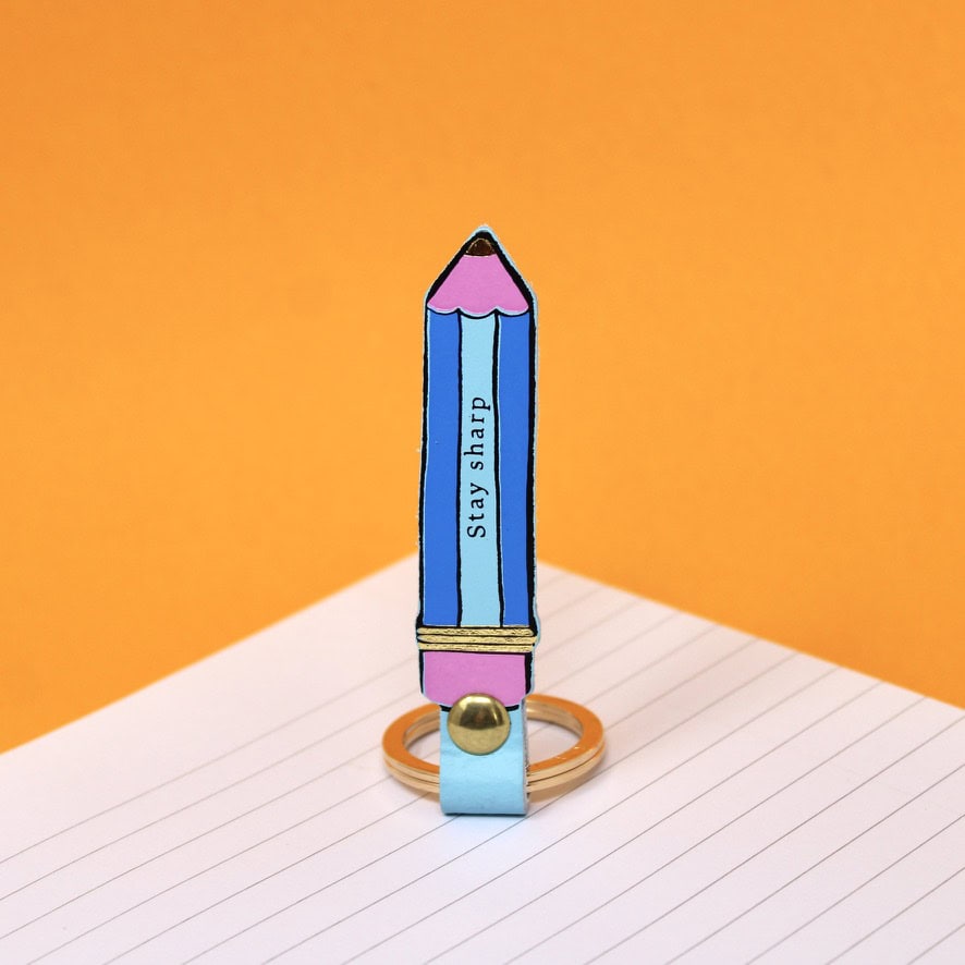 Each pencil is embossed with ‘Stay Sharp’ and complimented by three other foil colours. All of our key fobs are finished with a gold rivet and gold plated ring engraved with Ark Colour Design on the front and Real Leather on the reverse.