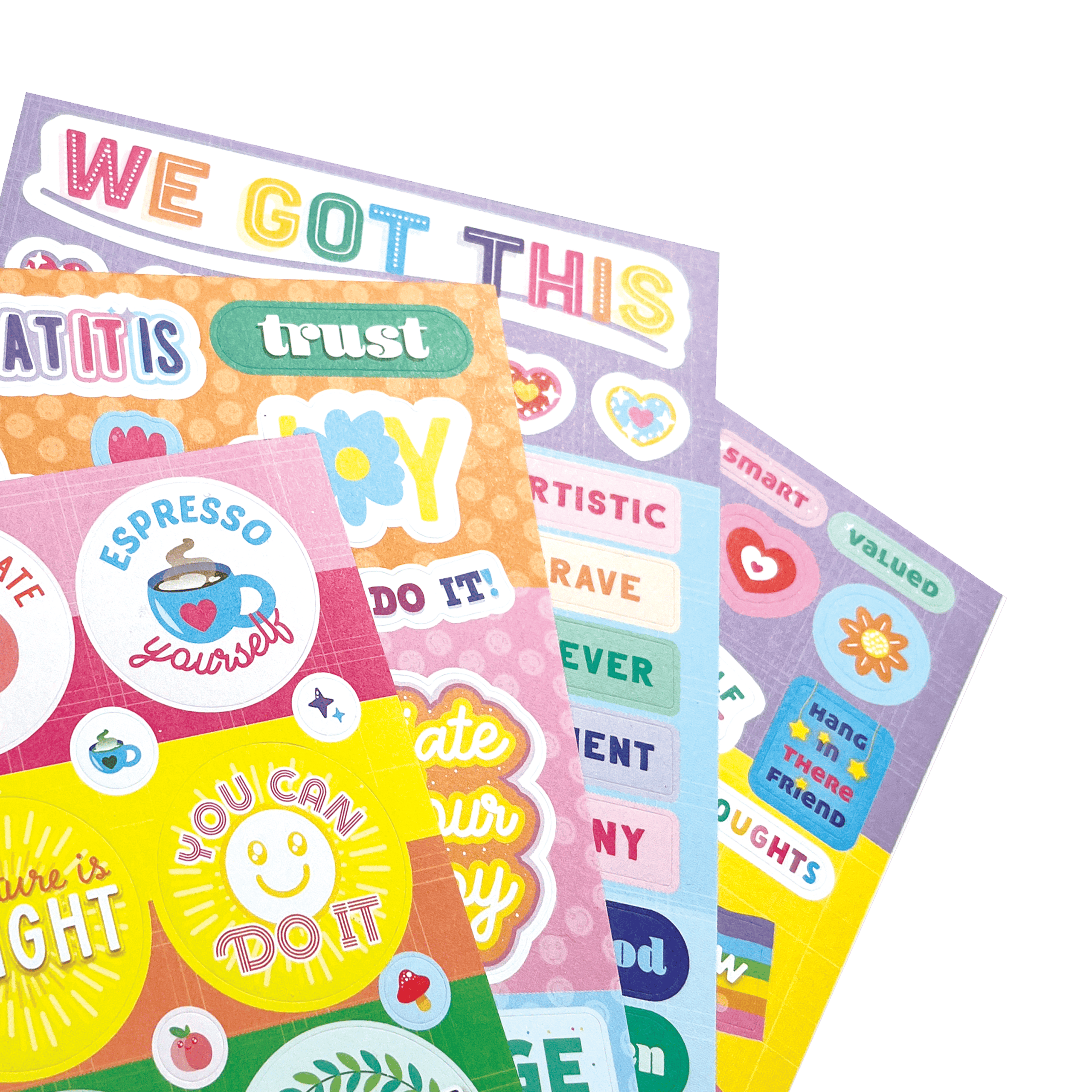 - Designs feature a motivational stickers with inspirational quotes like “Love Yourself” and “Radiate Positivity”