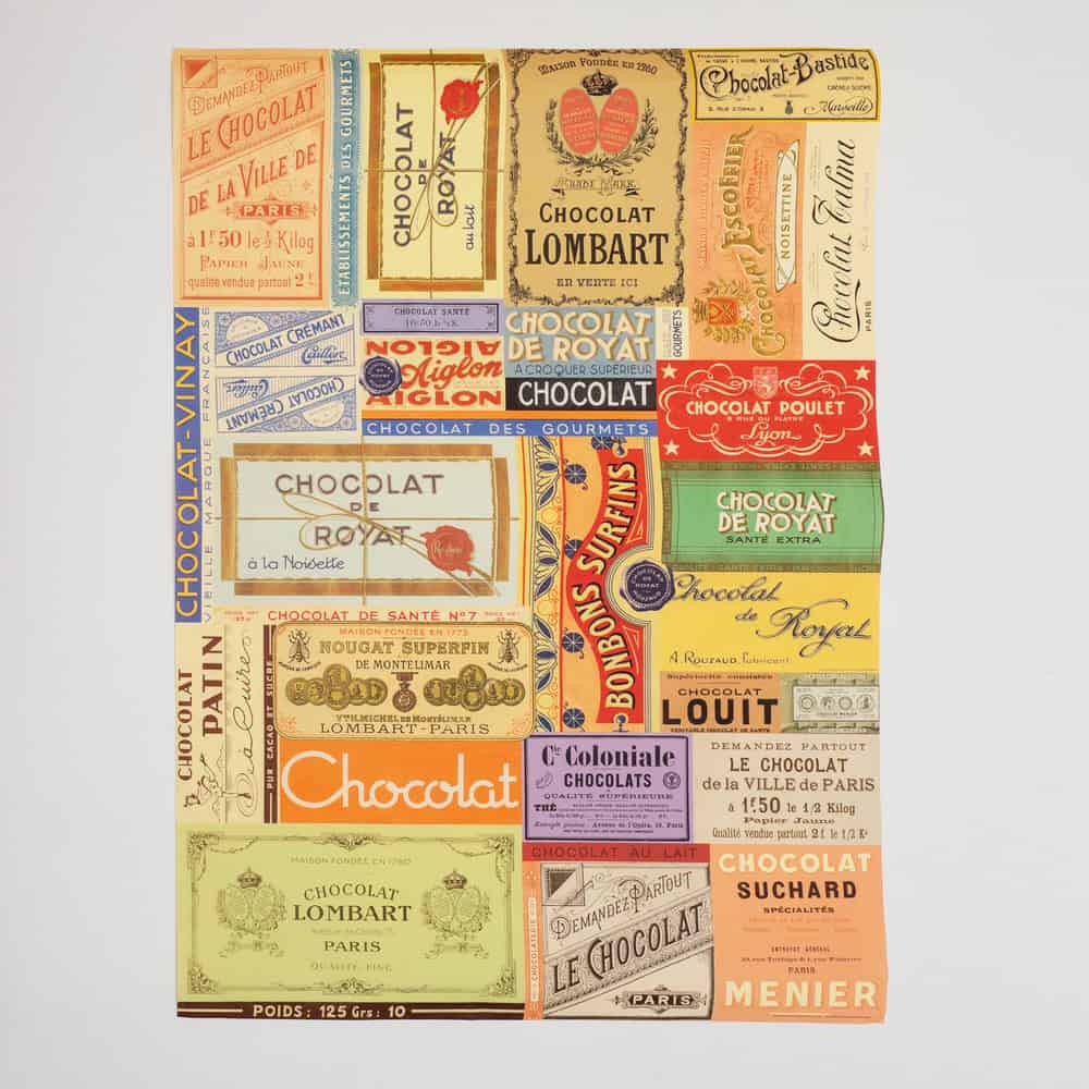 Vintage French chocolate labels collage for artisanal confectionery design, emphasizing luxury and tradition in chocolate branding.