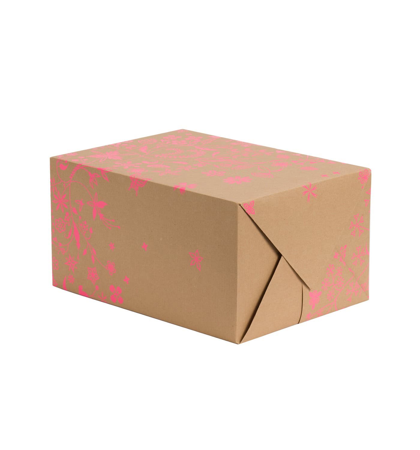 Colorful kraft paper food packaging box with pink floral and butterfly print for bakery, dessert or catering services.